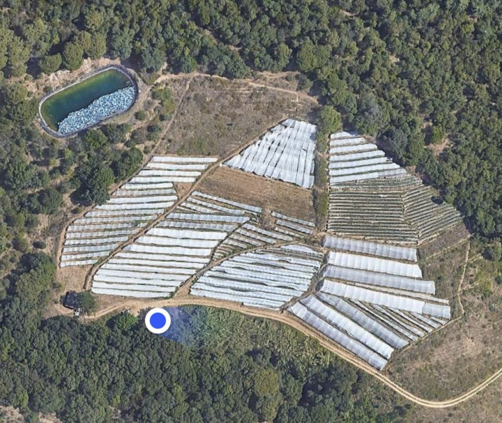 Vista aerea de la finca de 2 hectáreas de cultivo de fresas.
